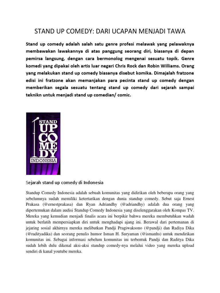 Stand up comedy sebenarnya muncul dari Inggris pada abad ke 18 19 namun mendapat popularitas yang cepat dari perkembangannya di US. 2 Identify the form of text structure discourse academy stand-up comedy. Raditya dika cak lontong dodit mulyanto kemal pahlevi pandji fico arie kriting.